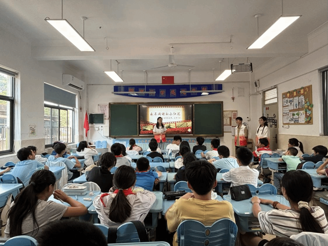 为进一步深入学习贯彻习近平新时代中国特色社会主义思想,弘扬革命精神,厚植青少年爱党爱国情怀,5月13日下午,武汉纺织大学马克思主义学院“初心”宣讲团走进武昌未来实验小学六年级D班,开展了一场主题为“永不凋零的小红花”的红色宣讲活动。